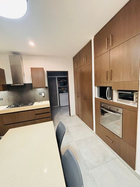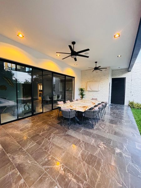 Portón eléctrico, estacionamiento techado para 3 autos , recibidor , medio baño de visitas, sala a doble altura y comedor con vista a la terraza trasera techada, con jardín, alberca con su baño completo y bar. Cocina amplia completamente equipada con campana.
